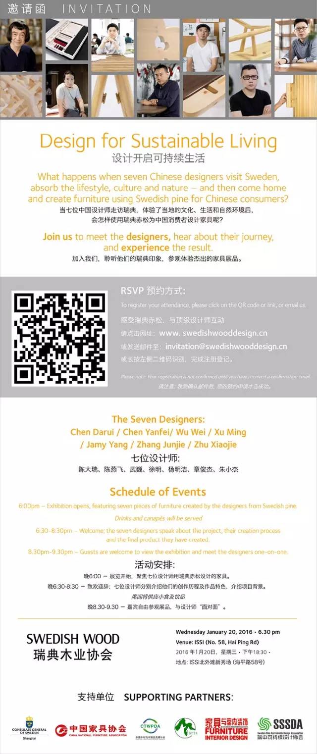 “設計開啟可持續生活-當中國設計師邂逅瑞典木業”設計作品發佈會將於2016年1月20日在上海ISSI北外灘新秀場舉行。屆時,小杰等七位設計師們為此次專案特別設計的傢俱作品,都將於當天展出。設計師們將與嘉賓面對面,分別介紹各自的作品、設計製作過程以及使用瑞典赤松的心得體會。