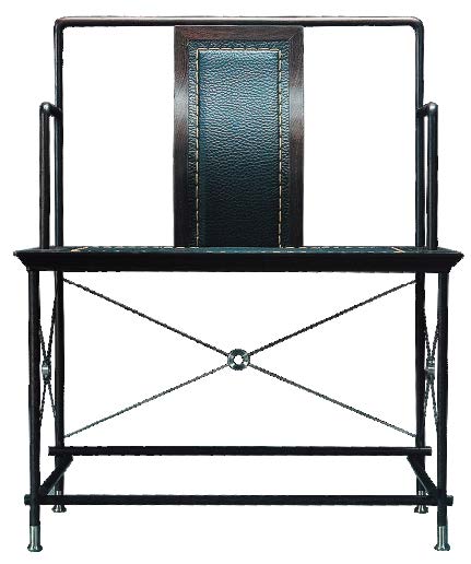 玫瑰椅是几百年前的中国很经典的一把椅子,在明朝极为流行,即便在现代的中国文人生活圈内也深受喜爱。由于其常常与书案搭配也称文椅。我尊重了玫瑰椅的原创意境与外型,采用了混凝土的原理,让钢筋串在极细的原木圆柱中,而不是水泥。以建筑金属结构的方式让其稳定扎实。牛皮坐垫用手工的方式被明线固定在深色的原木框中。浓郁的古典传统中,让金属的脚圈与钢丝攀线,透出极和谐的现代感。