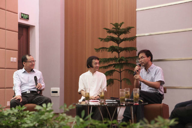 (2013年,溫州職業技術學院院長丁金昌與朱小傑老師在家具学院第一学期开学前的教育創新對話會上深切交流)